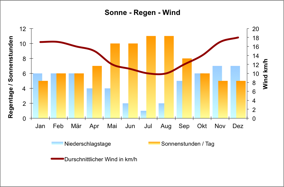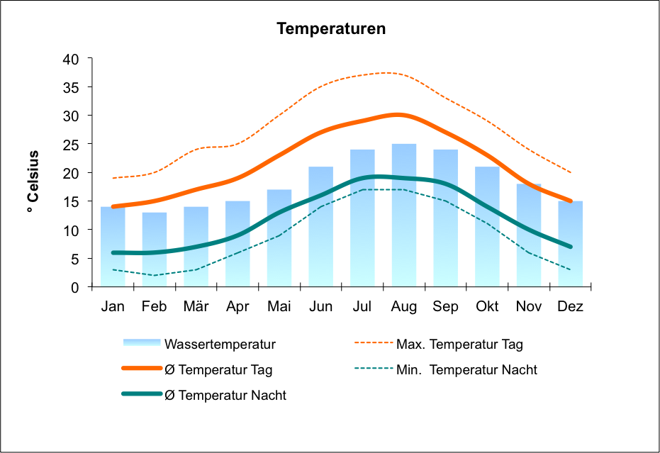 Ab Mitte April wird es langsam warm in den Balearen. Die Hochsaison ist heiss und trocken (Spitzen über 35 Grad vor allem im Inselinneren). Der September wartet mit perfektem Badewetter auf. Gegen Ende September dann meldet sich aber schon der Herbst mit unbeständigerem Wetter. Mitte Oktober endet die Saison auf den Balearen, ab November beginnt der Winter auf der Insel und bleibt bis einschließlich Februar.